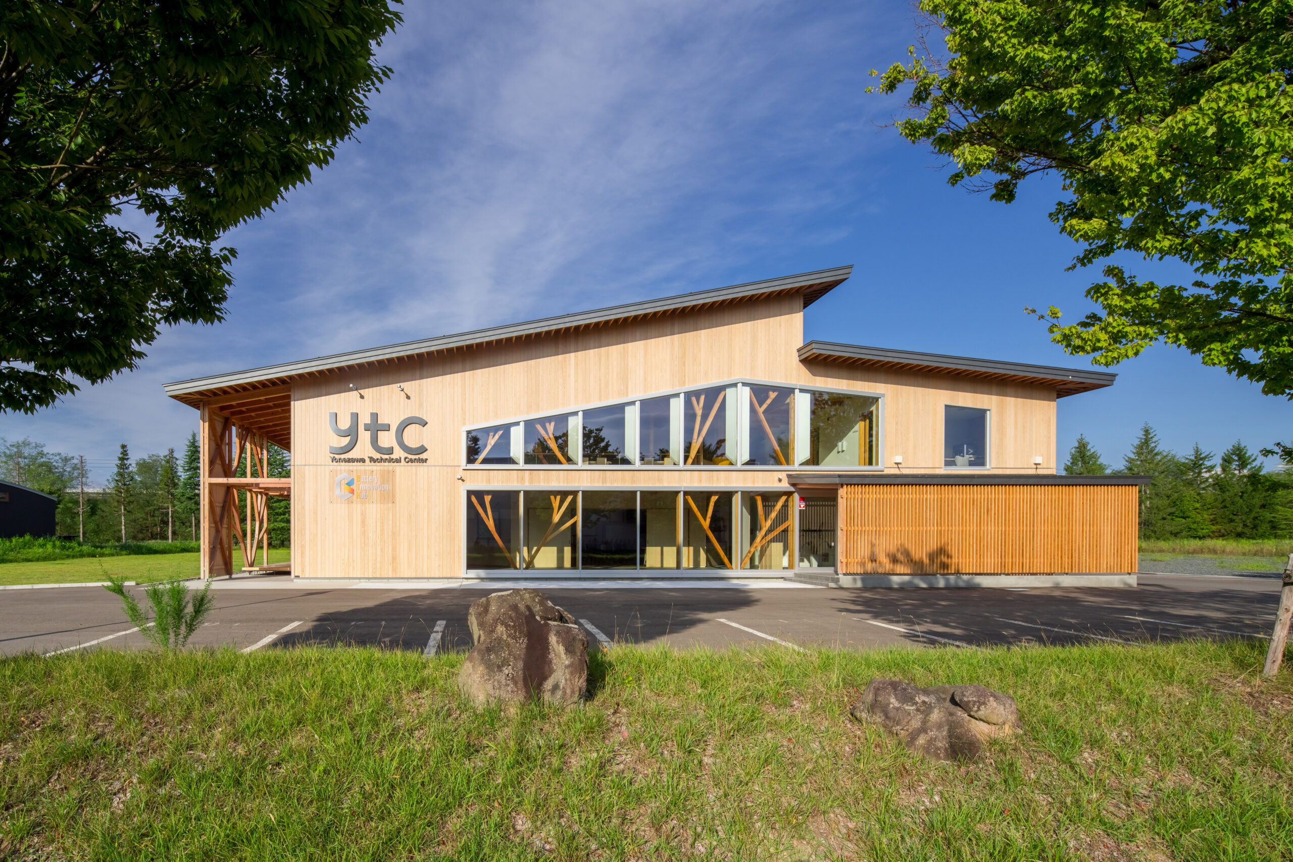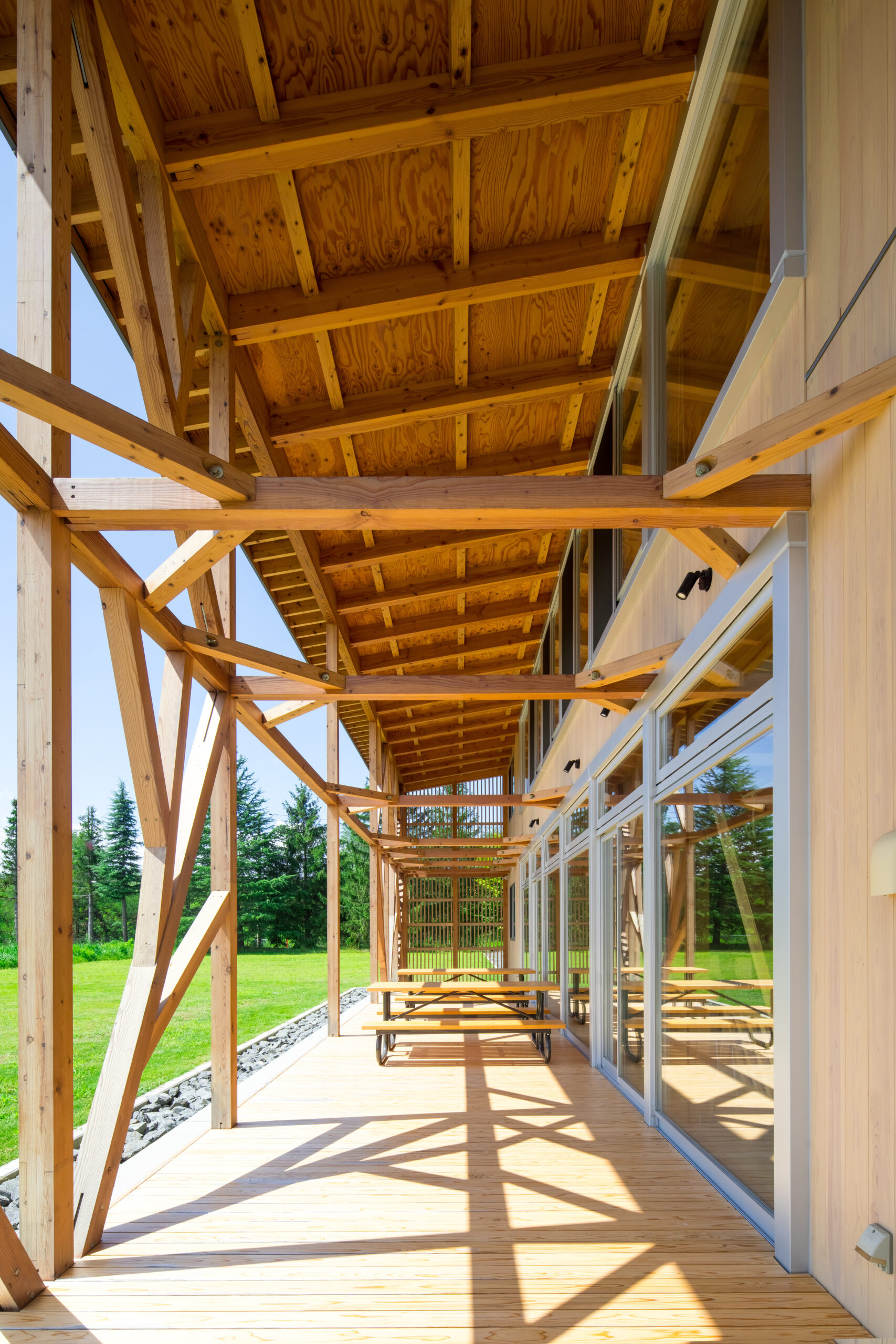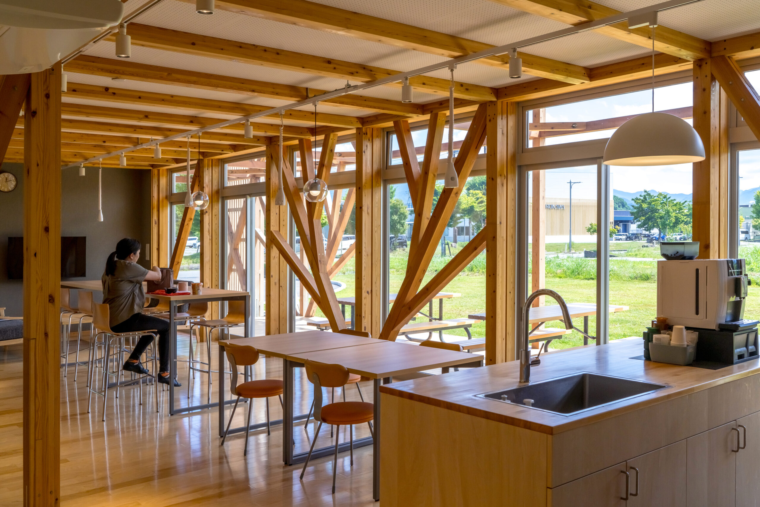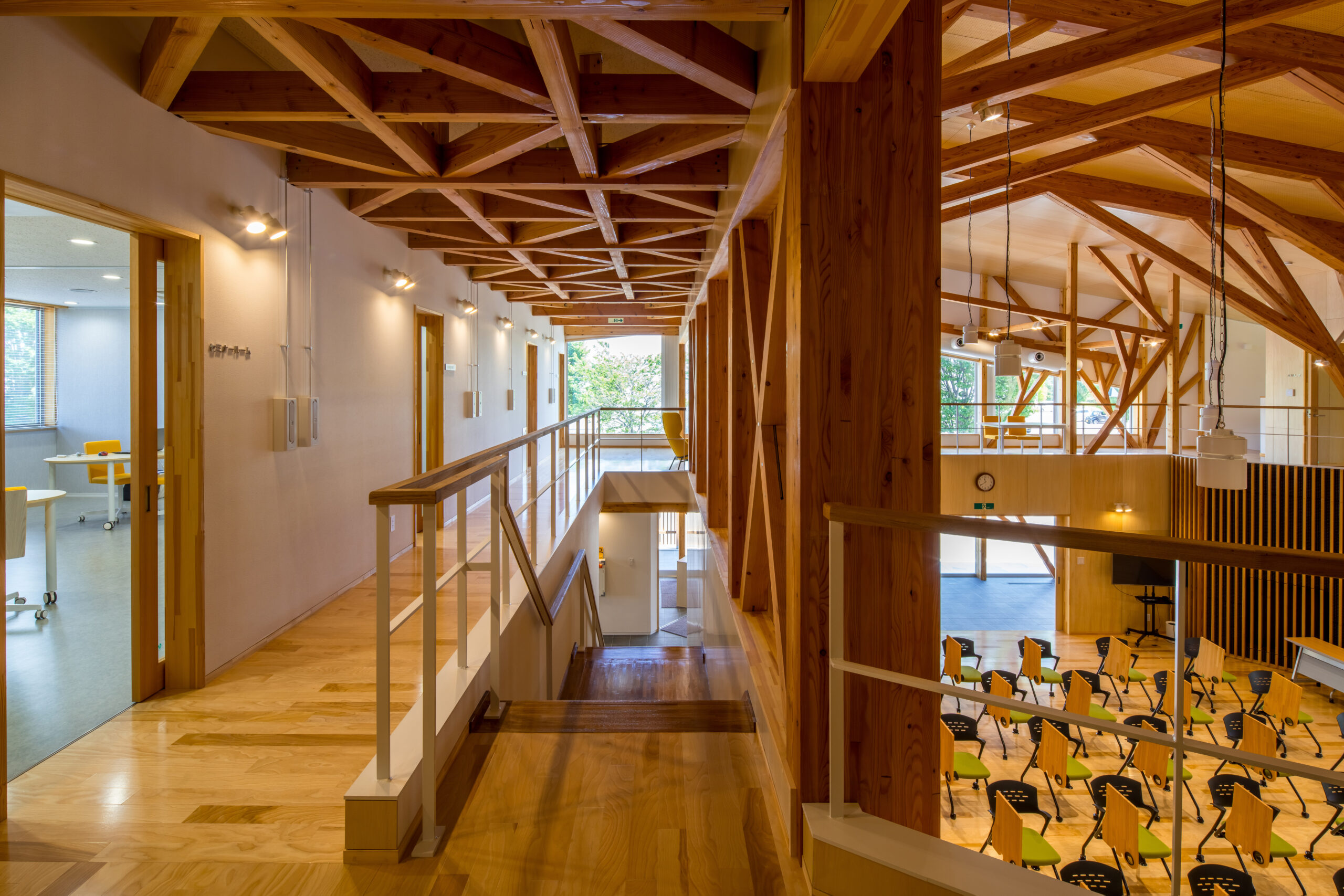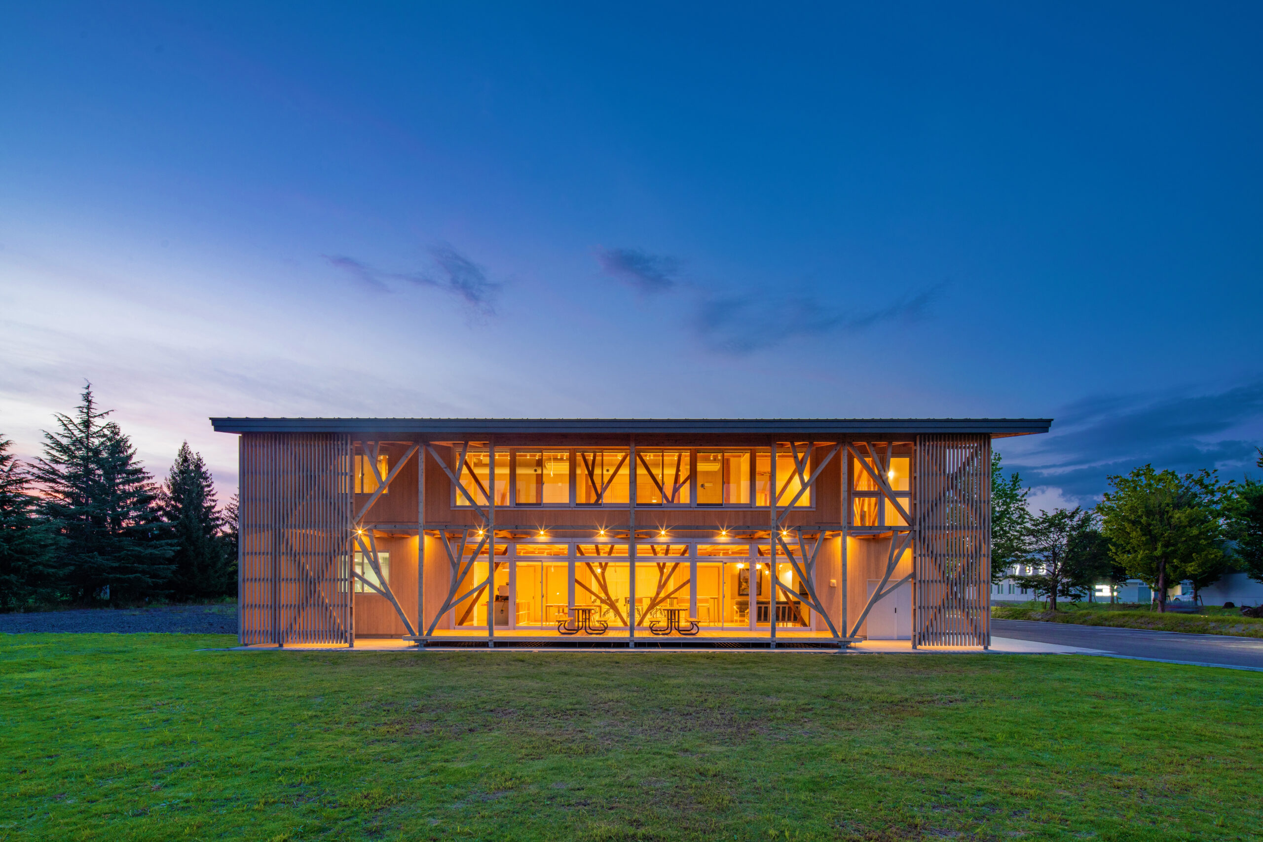 アルカディア工業団地内の企業や大学、高校との交流を促すため、建物の周りにテラスや緑地帯を設け、外部にも柔らかな表情を見せています。外壁は、クライアントが手掛けている液体ガラスを浸透させた木板貼りの外観としています。内部は、森の中の樹木や枝葉を連想させるように、柱・梁などの構造材を表しとし、木質感を存分に感じられる空間としています。