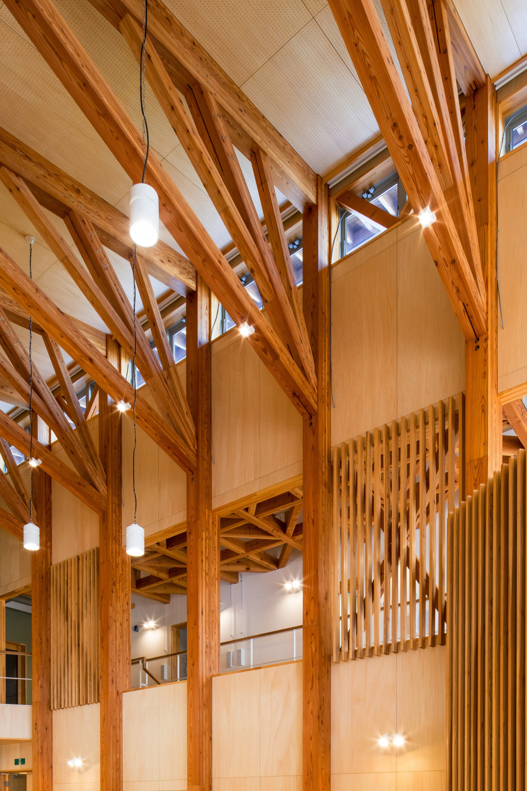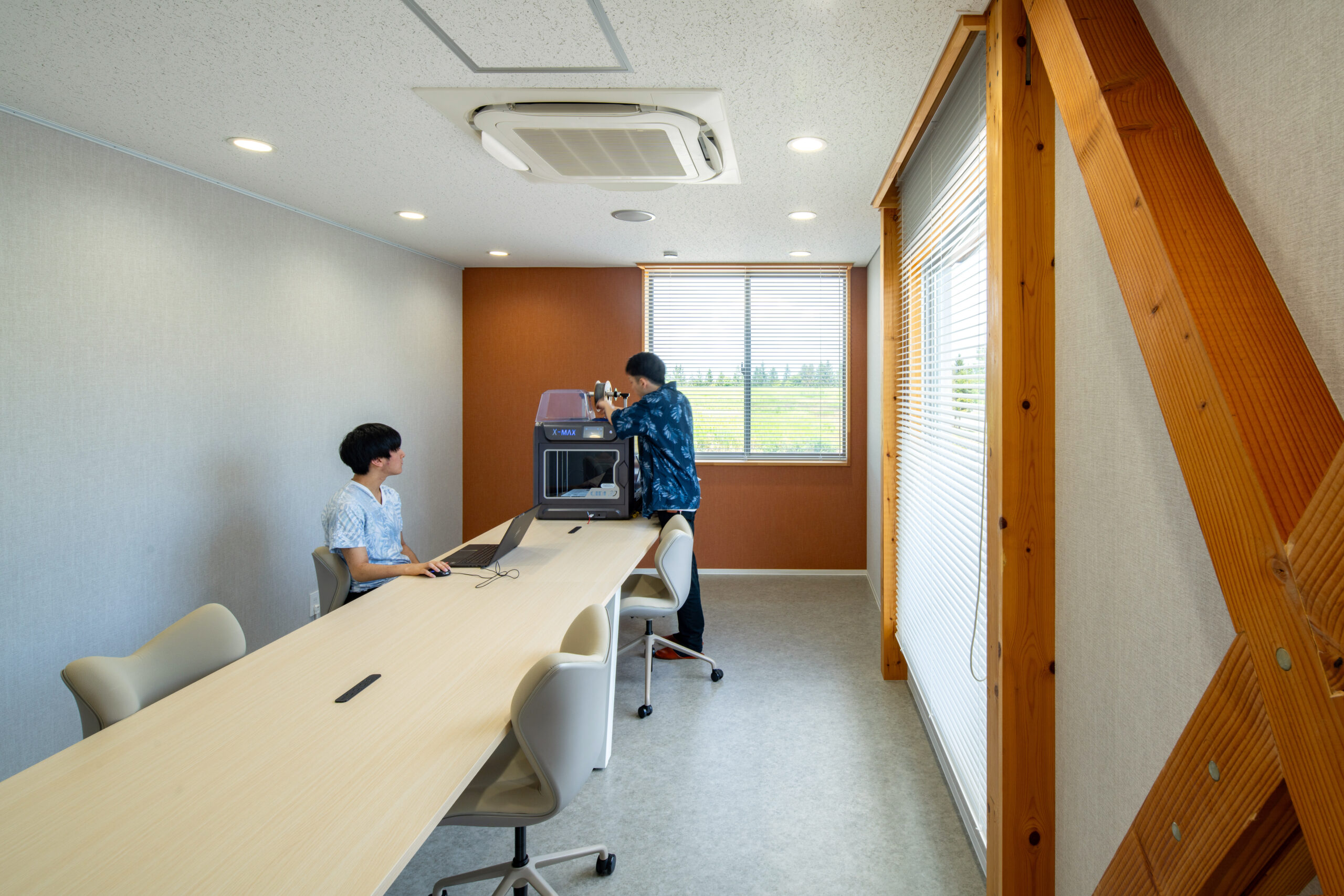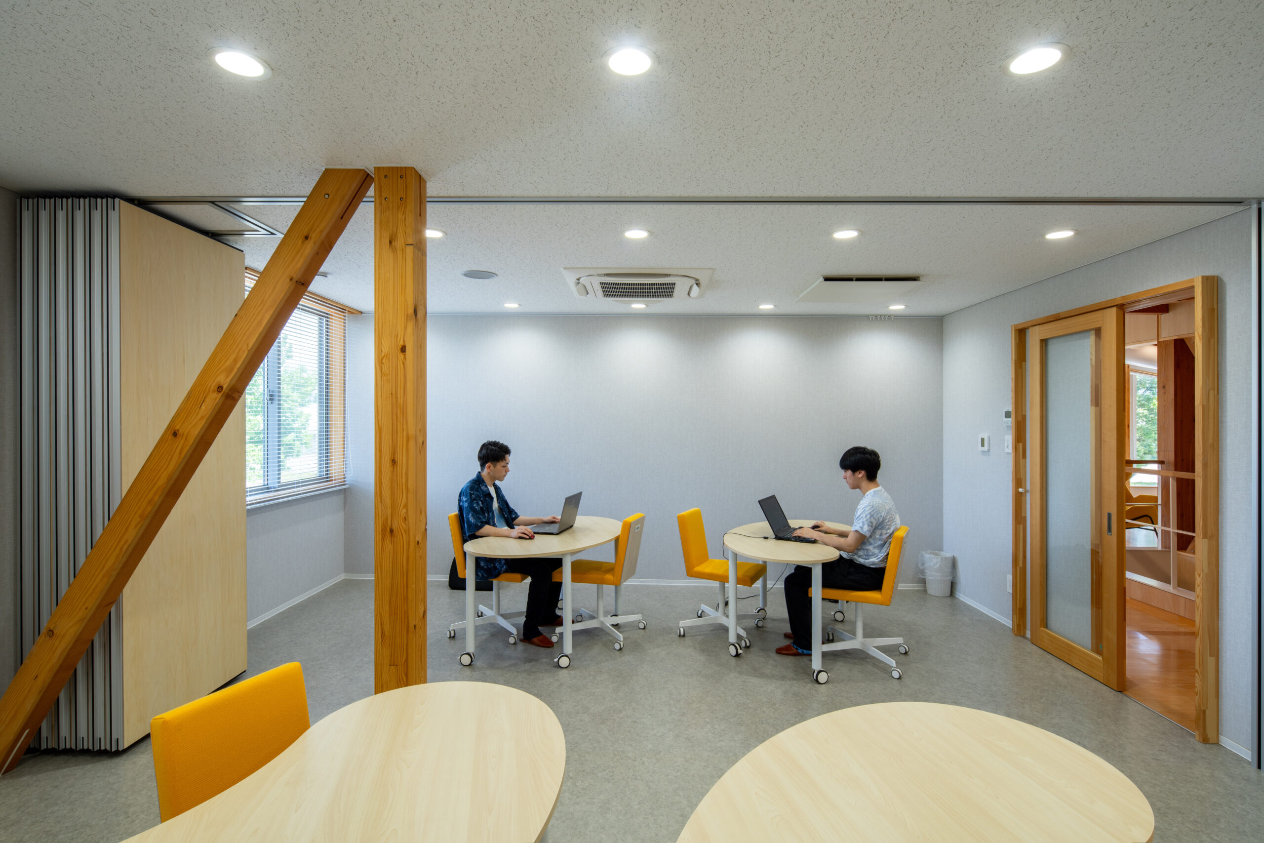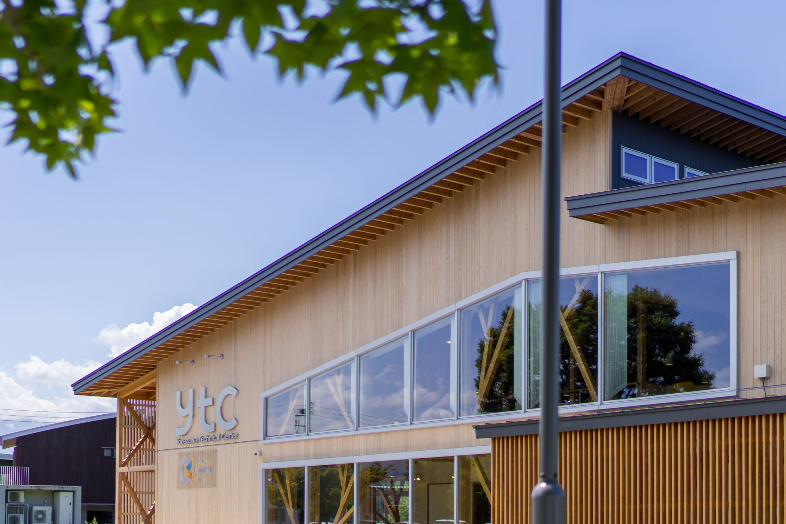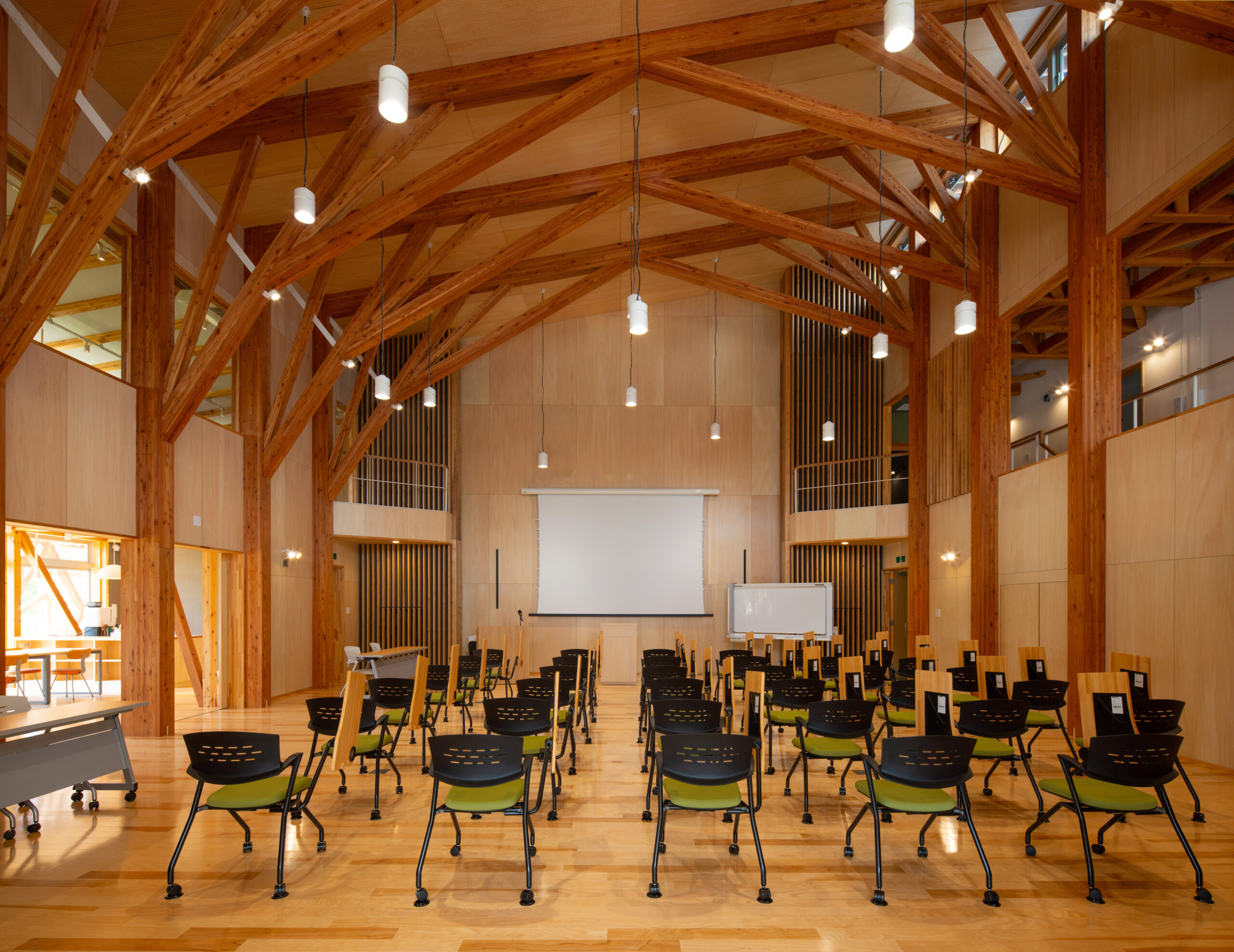 アルカディア工業団地内の企業や大学、高校との交流を促すため、建物の周りにテラスや緑地帯を設け、外部にも柔らかな表情を見せています。外壁は、クライアントが手掛けている液体ガラスを浸透させた木板貼りの外観としています。内部は、森の中の樹木や枝葉を連想させるように、柱・梁などの構造材を表しとし、木質感を存分に感じられる空間としています。